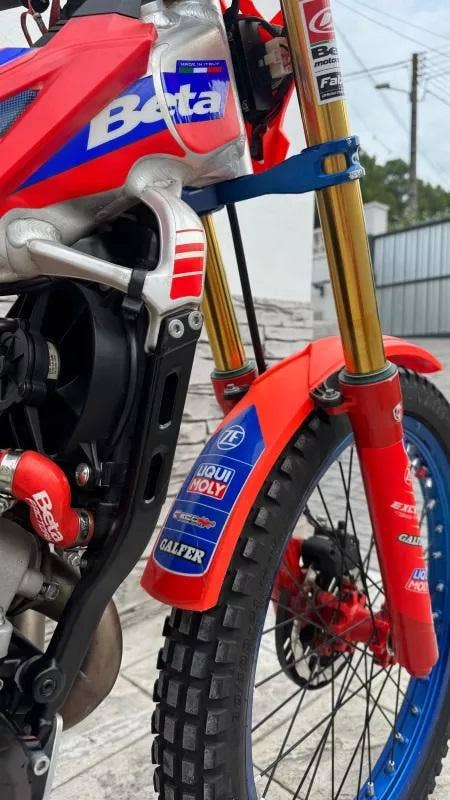 BETA Factory úprava - závodní oddělení, racing spojka, GECO stupačky, GECO klemy na řidítka, GECO odlehčené brýle, upravené přední a zadní tlumiče, odlehčené modré ráfky kol, GECO lyžina, DOMINO gripy, spojková a brzdová pumpa Grimeca, přídavné počítadlo motohodin.